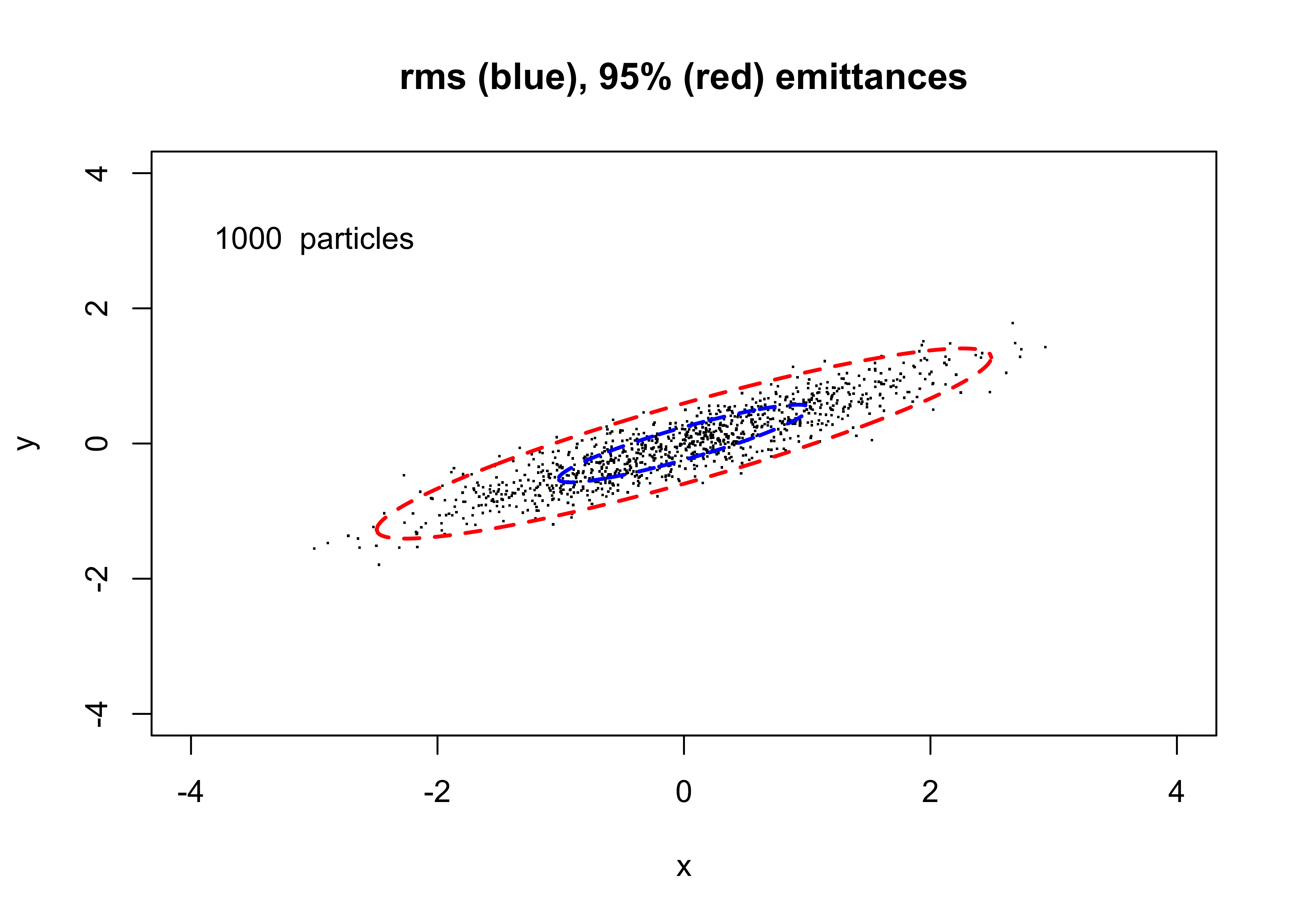 In our figure shown previously, we have used 1000 particles where the rms values of the two coordinates are \(x_{rms}\) = 1.018 and \(y_{rms}\) = 0.574; the coordinates are “correlated” with \(\langle xy \rangle\) = 0.53, and the determinant \(\det\Sigma\) has a value of 0.061.